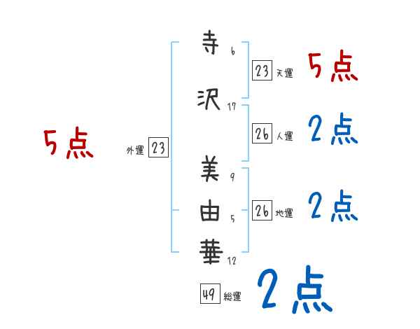 外運![]() | 寺沢美由華さんの外運は23画の5つ星!想像力に優れ活力がある。一代で成功し名誉を手に入れる。 生活面を象徴する運勢です。外部から受ける影響力を表し、結婚運、家庭運や職場、環境への順応性を表します。 |