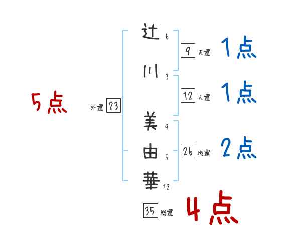 外運![]() | 辻川美由華さんの外運は23画の5つ星!想像力に優れ活力がある。一代で成功し名誉を手に入れる。 生活面を象徴する運勢です。外部から受ける影響力を表し、結婚運、家庭運や職場、環境への順応性を表します。 |