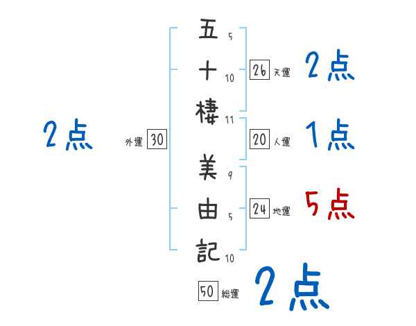 人運![]() | 五十棲美由記さんの人運は20画の1つ星!社交が苦手。人とは違った才能があり波乱万丈な人生かも。 性格や才能などを表す2番目に重要な運勢です。人間関係や協調性、社会的な成功に影響します。主に20歳から50歳ぐらいまでの中年期の運勢を表します。 |