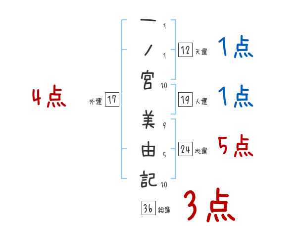 外運![]() | 一ノ宮美由記さんの外運は17画の4つ星!積極的な行動力。地位を気づき財産を手に入れる。純粋な心と直感力。 生活面を象徴する運勢です。外部から受ける影響力を表し、結婚運、家庭運や職場、環境への順応性を表します。 |