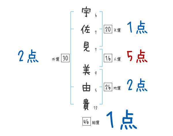 総運![]() | 宇佐見美由貴さんの総運は46画の1つ星!迷走することが多く苦労するかも。目先のことにとらわれないように。 あなたの人生を表す1番重要な運勢です。生涯を通じて影響する総合運となり、主に50歳以降の晩年期に影響を及ぼします。 |