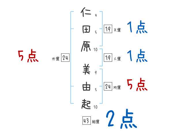 外運![]() | 仁田原美由起さんの外運は24画の5つ星!家庭運が良く順調な人生。金運にも恵まれる。 生活面を象徴する運勢です。外部から受ける影響力を表し、結婚運、家庭運や職場、環境への順応性を表します。 |