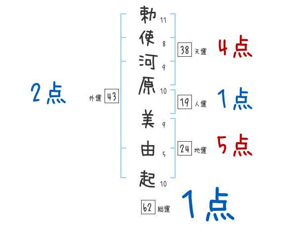 外運![]() | 勅使河原美由起さんの外運は43画の2つ星!頑固な性格で独立心が強いかも。やや非現実的で浪費に注意しましょう。 生活面を象徴する運勢です。外部から受ける影響力を表し、結婚運、家庭運や職場、環境への順応性を表します。 |