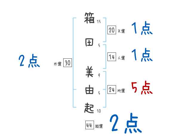外運![]() | 箱田美由起さんの外運は30画の2つ星!浮き沈みの激しさに注意しましょう。 生活面を象徴する運勢です。外部から受ける影響力を表し、結婚運、家庭運や職場、環境への順応性を表します。 |