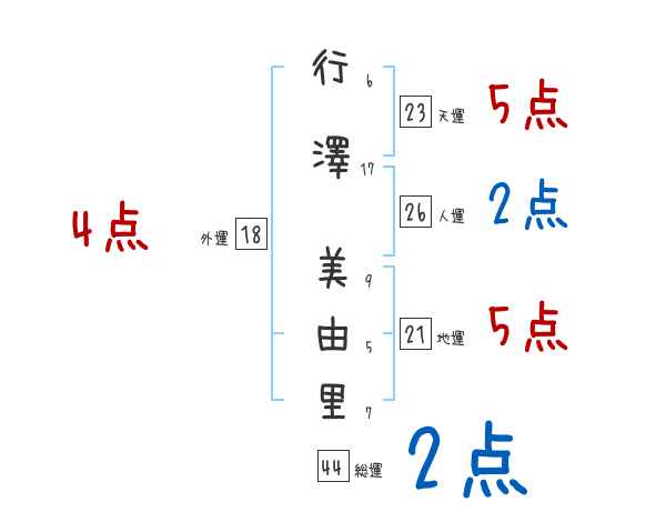 総運![]() | 行澤美由里さんの総運は44画の2つ星!誠実で慎重な性格。物事を考えすぎないように注意しましょう。 あなたの人生を表す1番重要な運勢です。生涯を通じて影響する総合運となり、主に50歳以降の晩年期に影響を及ぼします。 |