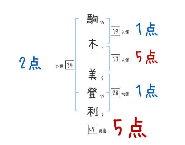天運![]() | 駒木美登利さんの天運は19画の1つ星!優れた才能を持ちますが、協調性が足りないことも。周りの人と協力する事を意識しましょう。 家系が持つ宿命的な運勢を表します。祖先から受け継いだ苗字ですので自分の力が及びません。家柄を象徴します。 |