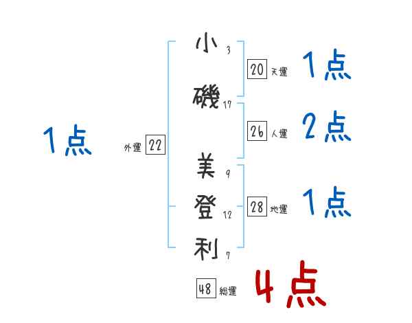 外運![]() | 小磯美登利さんの外運は22画の1つ星!努力することが苦手ないっぽう手先が器用。芸術性にも優れる。 生活面を象徴する運勢です。外部から受ける影響力を表し、結婚運、家庭運や職場、環境への順応性を表します。 |