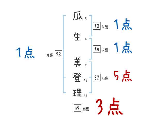 天運![]() | 瓜生美登理さんの天運は10画の1つ星!不安を感じやすい傾向。ストレスを抱えないように注意しましょう。 家系が持つ宿命的な運勢を表します。祖先から受け継いだ苗字ですので自分の力が及びません。家柄を象徴します。 |