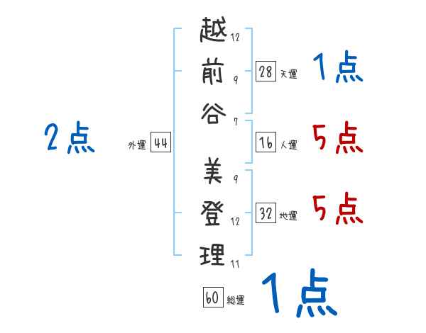人運![]() | 越前谷美登理さんの人運は16画の5つ星!人望が厚く大きく発展する。逆転成功が見える。 性格や才能などを表す2番目に重要な運勢です。人間関係や協調性、社会的な成功に影響します。主に20歳から50歳ぐらいまでの中年期の運勢を表します。 |
