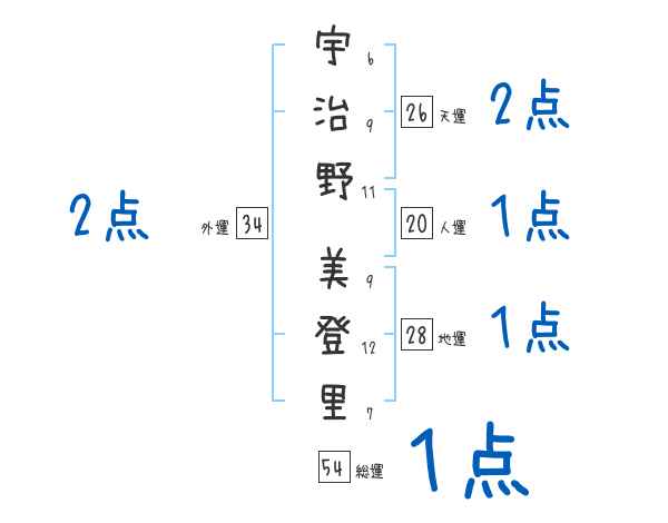 天運![]() | 宇治野美登里さんの天運は26画の2つ星!波瀾万丈かも。信頼できる人を大事にしましょう。 家系が持つ宿命的な運勢を表します。祖先から受け継いだ苗字ですので自分の力が及びません。家柄を象徴します。 |