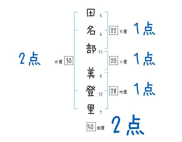 総運![]() | 田名部美登里さんの総運は50画の2つ星!浮き沈みが激しく不安定。しりすぼみに衰退しやすいので注意しましょう。 あなたの人生を表す1番重要な運勢です。生涯を通じて影響する総合運となり、主に50歳以降の晩年期に影響を及ぼします。 |