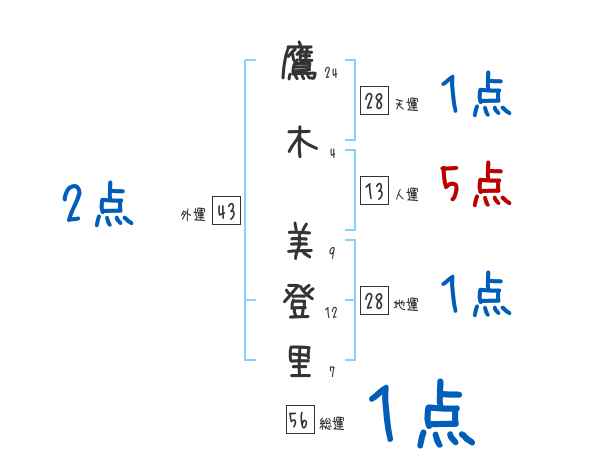 天運![]() | 鷹木美登里さんの天運は28画の1つ星!家庭環境に注意。スポーツで活躍できる能力があるかも。 家系が持つ宿命的な運勢を表します。祖先から受け継いだ苗字ですので自分の力が及びません。家柄を象徴します。 |
