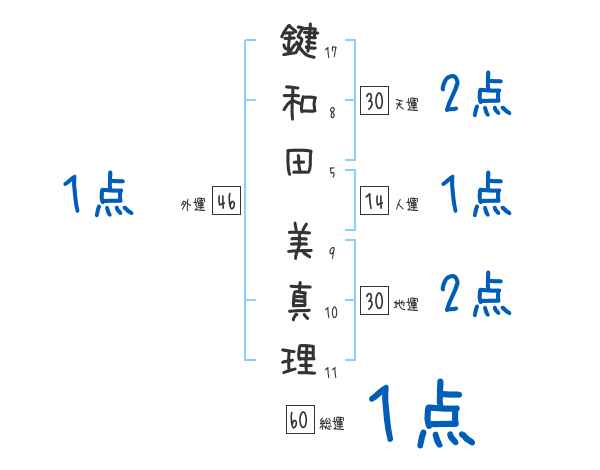 天運![]() | 鍵和田美真理さんの天運は30画の2つ星!浮き沈みの激しさに注意しましょう。 家系が持つ宿命的な運勢を表します。祖先から受け継いだ苗字ですので自分の力が及びません。家柄を象徴します。 |
