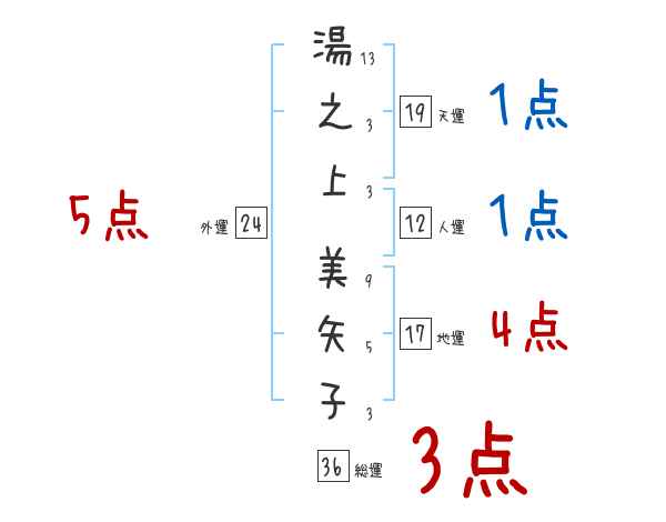 外運![]() | 湯之上美矢子さんの外運は24画の5つ星!家庭運が良く順調な人生。金運にも恵まれる。 生活面を象徴する運勢です。外部から受ける影響力を表し、結婚運、家庭運や職場、環境への順応性を表します。 |