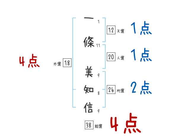 天運![]() | 一條美知信さんの天運は12画の1つ星!簡単な失敗で諦めてしまいやすいかも。着実に行動すると良いでしょう。 家系が持つ宿命的な運勢を表します。祖先から受け継いだ苗字ですので自分の力が及びません。家柄を象徴します。 |