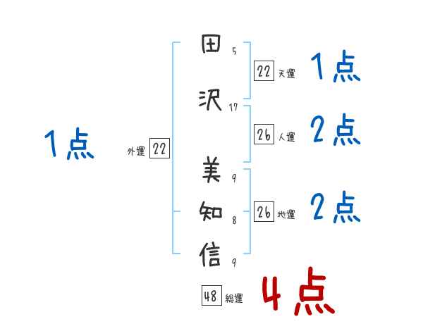 外運![]() | 田沢美知信さんの外運は22画の1つ星!努力することが苦手ないっぽう手先が器用。芸術性にも優れる。 生活面を象徴する運勢です。外部から受ける影響力を表し、結婚運、家庭運や職場、環境への順応性を表します。 |