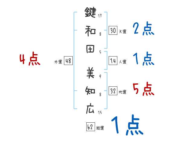 外運![]() | 鍵和田美知広さんの外運は48画の4つ星!賢明な性格で人望が厚い。指導力があり多くの人に尊敬される。 生活面を象徴する運勢です。外部から受ける影響力を表し、結婚運、家庭運や職場、環境への順応性を表します。 |