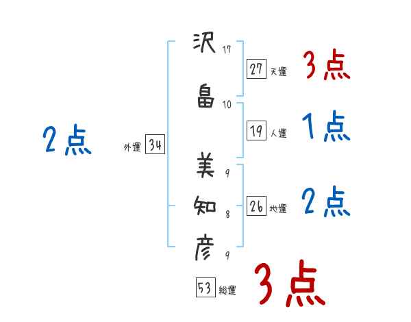 天運![]() | 沢畠美知彦さんの天運は27画の3つ星!頭脳明晰だが強情で摩擦が多い傾向。孤立に注意。 家系が持つ宿命的な運勢を表します。祖先から受け継いだ苗字ですので自分の力が及びません。家柄を象徴します。 |