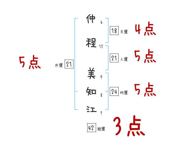 外運![]() | 仲程美知江さんの外運は21画の5つ星!統率力がある。独立し成功する。名誉を手に入れる。 生活面を象徴する運勢です。外部から受ける影響力を表し、結婚運、家庭運や職場、環境への順応性を表します。 |