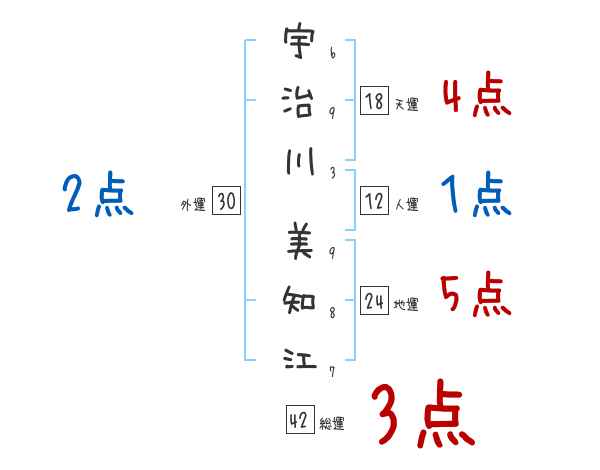 天運![]() | 宇治川美知江さんの天運は18画の4つ星!情熱的で剛気。忍耐力があり信頼される。 家系が持つ宿命的な運勢を表します。祖先から受け継いだ苗字ですので自分の力が及びません。家柄を象徴します。 |