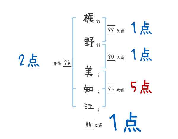 外運![]() | 梶野美知江さんの外運は26画の2つ星!波瀾万丈かも。信頼できる人を大事にしましょう。 生活面を象徴する運勢です。外部から受ける影響力を表し、結婚運、家庭運や職場、環境への順応性を表します。 |