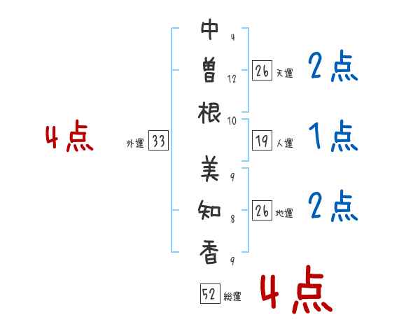 外運![]() | 中曽根美知香さんの外運は33画の4つ星!権力志向でプライドが高い。勇気があり運を切り開き成功する。 生活面を象徴する運勢です。外部から受ける影響力を表し、結婚運、家庭運や職場、環境への順応性を表します。 |