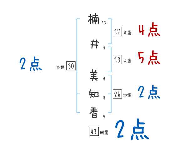 人運![]() | 楠井美知香さんの人運は13画の5つ星!才能に恵まれ人気がある。名声を手に入れる。円満な人生。 性格や才能などを表す2番目に重要な運勢です。人間関係や協調性、社会的な成功に影響します。主に20歳から50歳ぐらいまでの中年期の運勢を表します。 |