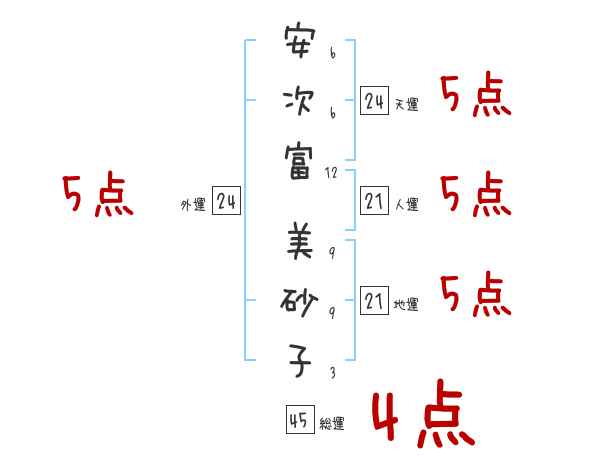 天運![]() | 安次富美砂子さんの天運は24画の5つ星!家庭運が良く順調な人生。金運にも恵まれる。 家系が持つ宿命的な運勢を表します。祖先から受け継いだ苗字ですので自分の力が及びません。家柄を象徴します。 |