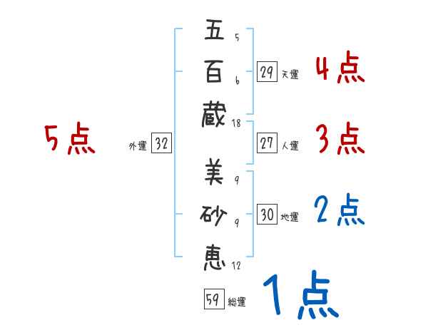 外運![]() | 五百蔵美砂恵さんの外運は32画の5つ星!柔軟性があり成功する。チャンスが多く金運が良い。 生活面を象徴する運勢です。外部から受ける影響力を表し、結婚運、家庭運や職場、環境への順応性を表します。 |