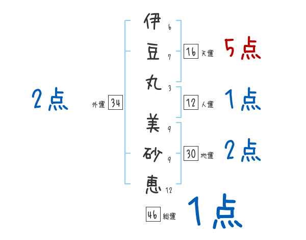 総運![]() | 伊豆丸美砂恵さんの総運は46画の1つ星!迷走することが多く苦労するかも。目先のことにとらわれないように。 あなたの人生を表す1番重要な運勢です。生涯を通じて影響する総合運となり、主に50歳以降の晩年期に影響を及ぼします。 |