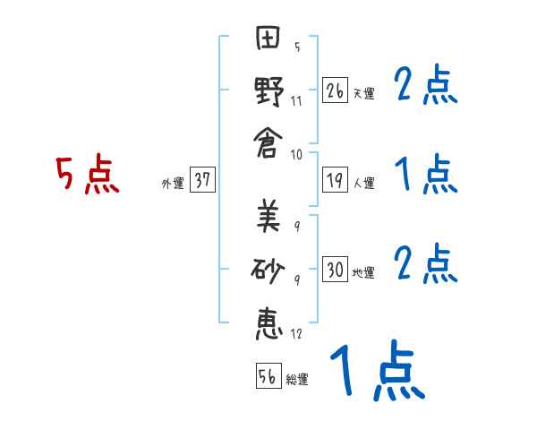 外運![]() | 田野倉美砂恵さんの外運は37画の5つ星!努力家で順応性に優れる。現実的な考え方ができ忠実に物事をこなす。 生活面を象徴する運勢です。外部から受ける影響力を表し、結婚運、家庭運や職場、環境への順応性を表します。 |