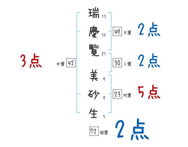 天運![]() | 瑞慶覧美砂生さんの天運は49画の2つ星!不安定な性格で明暗がある人生。周りの人には支援されやすい。 家系が持つ宿命的な運勢を表します。祖先から受け継いだ苗字ですので自分の力が及びません。家柄を象徴します。 |