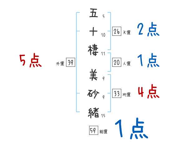 外運![]() | 五十棲美砂緒さんの外運は39画の5つ星!社交性に優れ人望が厚い。人の上に立ち成功する。 生活面を象徴する運勢です。外部から受ける影響力を表し、結婚運、家庭運や職場、環境への順応性を表します。 |