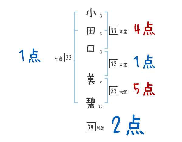 総運![]() | 小田口美碧さんの総運は34画の2つ星!独創性に優れるが、自尊心が強く災難に注意しましょう。 あなたの人生を表す1番重要な運勢です。生涯を通じて影響する総合運となり、主に50歳以降の晩年期に影響を及ぼします。 |