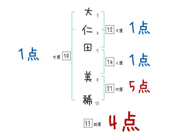 天運![]() | 大仁田美稀さんの天運は12画の1つ星!簡単な失敗で諦めてしまいやすいかも。着実に行動すると良いでしょう。 家系が持つ宿命的な運勢を表します。祖先から受け継いだ苗字ですので自分の力が及びません。家柄を象徴します。 |