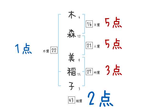 総運![]() | 木森美稲子さんの総運は43画の2つ星!頑固な性格で独立心が強いかも。やや非現実的で浪費に注意しましょう。 あなたの人生を表す1番重要な運勢です。生涯を通じて影響する総合運となり、主に50歳以降の晩年期に影響を及ぼします。 |