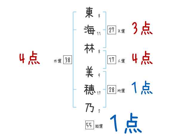 外運![]() | 東海林美穂乃さんの外運は38画の4つ星!温厚な性格で技術的な才能を発揮する。職人的な仕事に向いている。 生活面を象徴する運勢です。外部から受ける影響力を表し、結婚運、家庭運や職場、環境への順応性を表します。 |