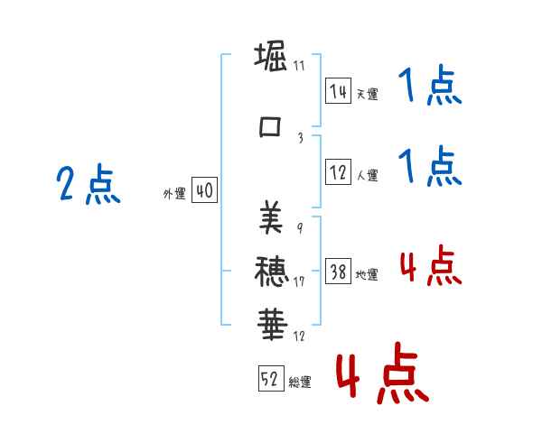 外運![]() | 堀口美穂華さんの外運は40画の2つ星!自信過剰で物事に固執するためトラブルに注意。 生活面を象徴する運勢です。外部から受ける影響力を表し、結婚運、家庭運や職場、環境への順応性を表します。 |