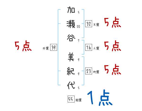 天運![]() | 加瀬谷美紀代さんの天運は32画の5つ星!柔軟性があり成功する。チャンスが多く金運が良い。 家系が持つ宿命的な運勢を表します。祖先から受け継いだ苗字ですので自分の力が及びません。家柄を象徴します。 |