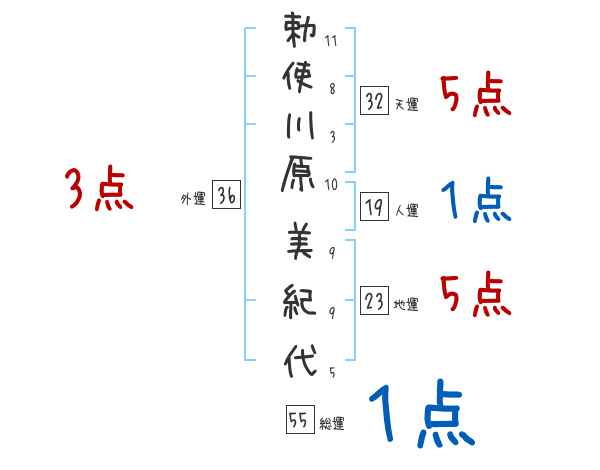 天運![]() | 勅使川原美紀代さんの天運は32画の5つ星!柔軟性があり成功する。チャンスが多く金運が良い。 家系が持つ宿命的な運勢を表します。祖先から受け継いだ苗字ですので自分の力が及びません。家柄を象徴します。 |