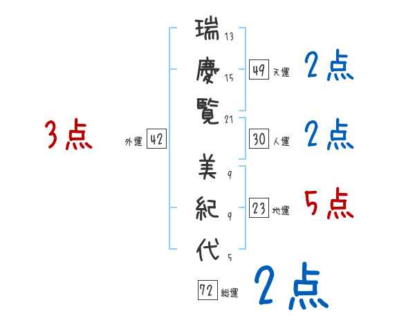 総運![]() | 瑞慶覧美紀代さんの総運は72画の2つ星!災難が多く不安定な生活にならないように注意。明暗のある人生かも。 あなたの人生を表す1番重要な運勢です。生涯を通じて影響する総合運となり、主に50歳以降の晩年期に影響を及ぼします。 |