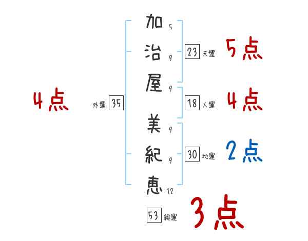 外運![]() | 加治屋美紀恵さんの外運は35画の4つ星!温厚な性格で感受性が高い。穏和な性格で人望が厚い。 生活面を象徴する運勢です。外部から受ける影響力を表し、結婚運、家庭運や職場、環境への順応性を表します。 |