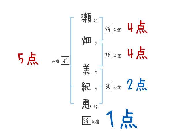 天運![]() | 瀬畑美紀恵さんの天運は29画の4つ星!完全主義で才能がある。厳格な心の持ち主。 家系が持つ宿命的な運勢を表します。祖先から受け継いだ苗字ですので自分の力が及びません。家柄を象徴します。 |