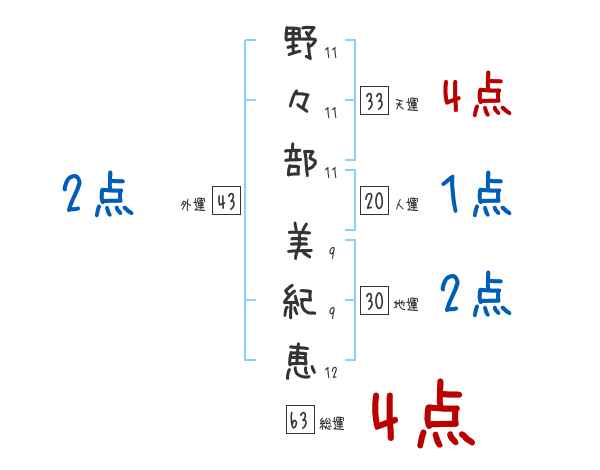 天運![]() | 野々部美紀恵さんの天運は33画の4つ星!権力志向でプライドが高い。勇気があり運を切り開き成功する。 家系が持つ宿命的な運勢を表します。祖先から受け継いだ苗字ですので自分の力が及びません。家柄を象徴します。 |
