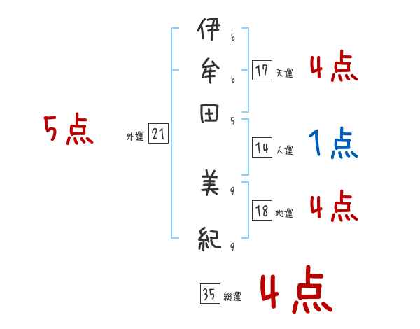 外運![]() | 伊牟田美紀さんの外運は21画の5つ星!統率力がある。独立し成功する。名誉を手に入れる。 生活面を象徴する運勢です。外部から受ける影響力を表し、結婚運、家庭運や職場、環境への順応性を表します。 |