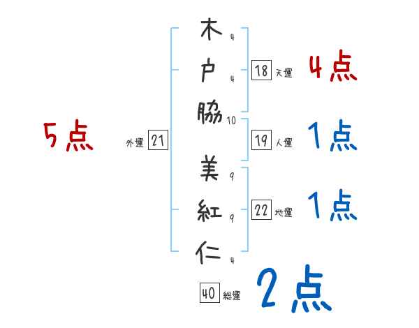 天運![]() | 木戸脇美紅仁さんの天運は18画の4つ星!情熱的で剛気。忍耐力があり信頼される。 家系が持つ宿命的な運勢を表します。祖先から受け継いだ苗字ですので自分の力が及びません。家柄を象徴します。 |
