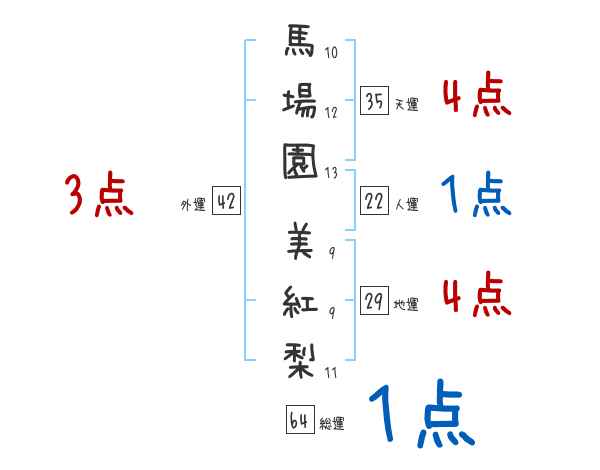 外運![]() | 馬場園美紅梨さんの外運は42画の3つ星!病気に注意。多芸であるが消極的でおとなしい。 生活面を象徴する運勢です。外部から受ける影響力を表し、結婚運、家庭運や職場、環境への順応性を表します。 |