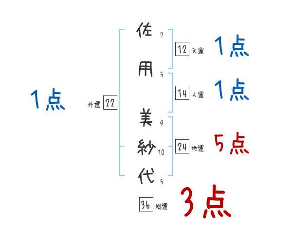 総運![]() | 佐用美紗代さんの総運は36画の3つ星!先見性が豊かです。多少神経質で苦労することも。 あなたの人生を表す1番重要な運勢です。生涯を通じて影響する総合運となり、主に50歳以降の晩年期に影響を及ぼします。 |