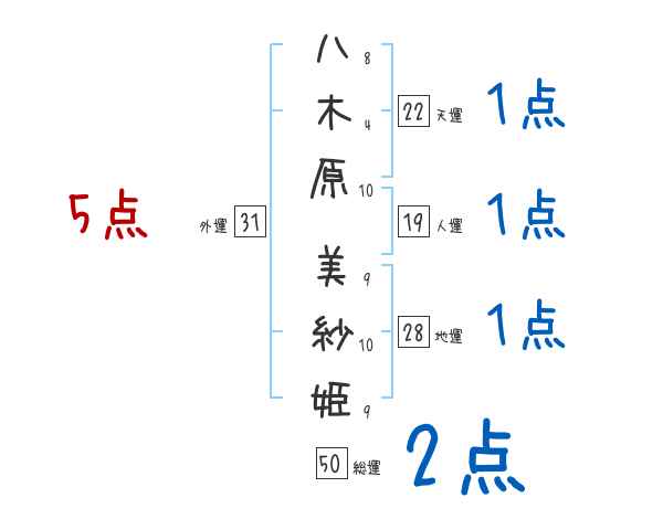 外運![]() | 八木原美紗姫さんの外運は31画の5つ星!社交性があり判断力に優れる。順風満帆な人生で円満な生活。 生活面を象徴する運勢です。外部から受ける影響力を表し、結婚運、家庭運や職場、環境への順応性を表します。 |