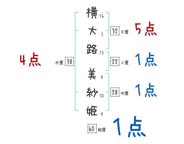 天運![]() | 横大路美紗姫さんの天運は32画の5つ星!柔軟性があり成功する。チャンスが多く金運が良い。 家系が持つ宿命的な運勢を表します。祖先から受け継いだ苗字ですので自分の力が及びません。家柄を象徴します。 |
